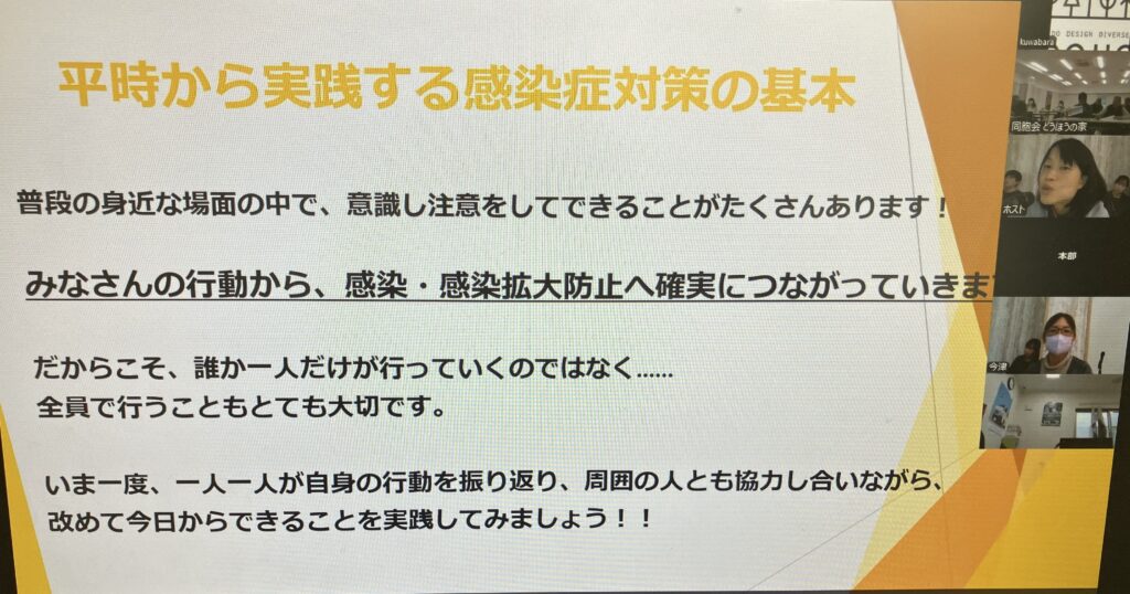 続いて、日頃から実践できる基本的な予防策(手洗い・消毒・環境整備など)を復習し、一人ひとりの意識向上につなげました!