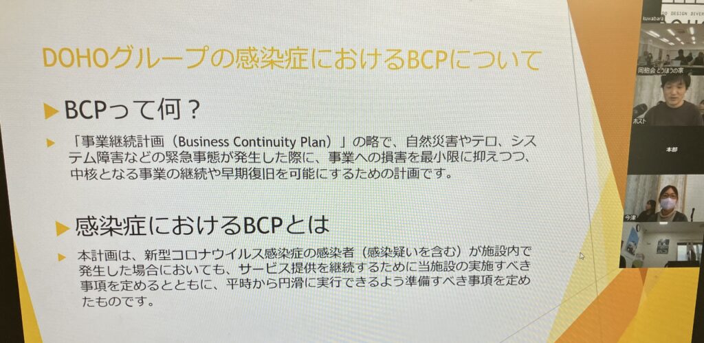 DOHOグループでは、年に1回、全職員を対象に「感染症対策研修」を実施しています。