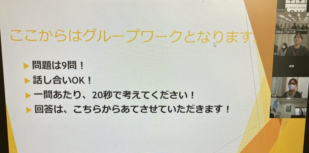 今回は、会場と各施設をzoomでつなぎ、合同の全体研修として実施しました。